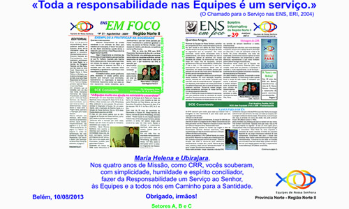 “Esta é a derradeira Missa Mensal em que Maria Helena e Ubirajara participam como Casal Responsável da Região. Ao longo de quatro anos eles desempenharam esta Missão com muita dedicação e amor ao Movimento e aos equipistas. Com simplicidade, humildade e espírito conciliador eles souberam fazer da Responsabilidade um Serviço ao Senhor, às Equipes e a todos nós. Para registrar a nossa gratidão a esse jeito cristão de fazer as coisas, os Setores A, B e C, de Belém, entregam a Maria Helena e Ubirajara este quadro com essa mensagem de agradecimento e estas flores, que são nosso sinal de bem-querer para sempre.”