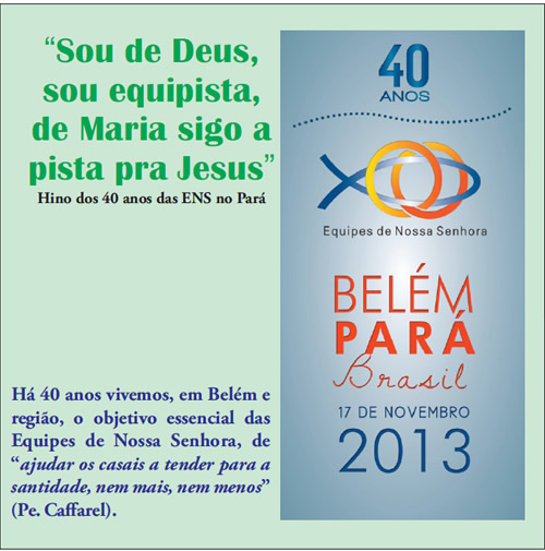 Na comemoração dos 40 anos do lançamento da primeira Equipe de Nossa Senhora em Belém, no final do ano passado, foi apresentado, em primeira audição, o “Hino dos 40 anos das ENS no Pará”, composto pelo equipista Antonio Salame, da Sílvia, da Equipe 11A.