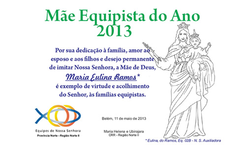 Casada há 59 anos, equipista há 36 anos, mãe do Paulo de Tarso, da Maria Bernardete, do Manoel José, da Maria Lúcia, a Mãe Equipista do Ano – 2013 é a Eulina do Ramos, Equipe 2B, Nossa Senhora Auxiliadora.