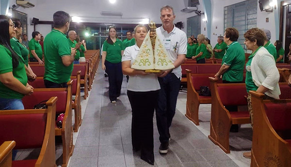 Casal Lu e Nelson levando a imagem de Nossa Senhora de Nazaré, na Procissão de Entrada da Celebração.