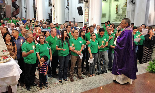Casais, velas acesas na mão, recebem o Envio para serem Luz no mundo.