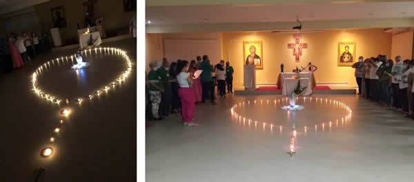 Um grande Rosário de velinhas (no lugar das contas), que eram acesas quando rezadas as Ave-Marias e os Pai-Nossos. Momento muito lindo.