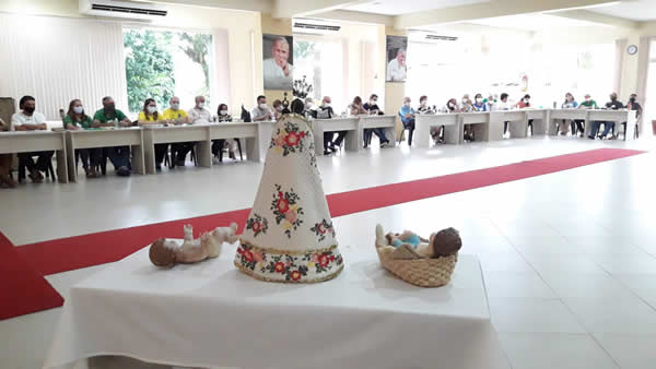 As imagens de N. S. de Nazaré e do Menino Jesus contemplam e abençoam os participantes do Retiro 2021 de Belém. Momento Deus-Conosco.