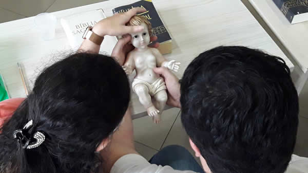 Casal contempla a imagem do Menino Jesus, adorando o Menino Deus. Momento muito emocionante.
