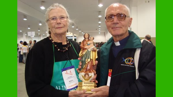 Em um domingo de 1973 um casal catarinense, Mônica e Plínio Hahn, após a Santa Missa na Basílica de Nazaré, em Belém, procurou o celebrante, o jovem padre Giovanni Incampo e apresentou-se como equipista em sua cidade de origem, Brusque, SC, recém mudado para Belém. Mas na cidade ainda não haviam Equipes de Nossa Senhora. Eles explicaram ao sacerdote as ENS, seu carisma e mística, origem, etc. O jovem padre Giovanni Incampo se apaixonou pela ideia. Um dia escreveu: “Foi simplesmente a obrigação de um casal católico? Não foi. Mônica e Plínio, da ENS de Brusque, foi o instrumento humano que Nossa Senhora acompanhou, do Sul para o Norte do Brasil, para instalar na sua cidade de Belém o seu Movimento de casais católicos.” Daí para o lançamento da primeira Equipe foi um passo: em 17/11/1973 nascia a Equipe N. S. de Nazaré, com o Pe. Giovanni como SCE e Mônica e Plínio como Casal Piloto. Na foto acima dois pioneiros, no Encontro Nacional das ENS de Florianópolis, em 2009. Mônica recebe do Pe. Giovanni uma réplica da Imagem Peregrina de N. S. de Nazaré. Este amado Sacerdote continua ativo como SCE, 47 anos após “apadrinhar” a chegada deste maravilhoso Movimento a Belém.