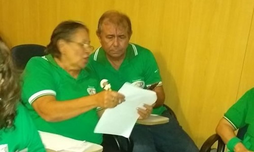 Casal Norma e Heliomar (Nêgo), um dos jurados da alegre gincana, conferindo suas notas.