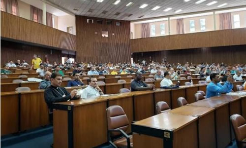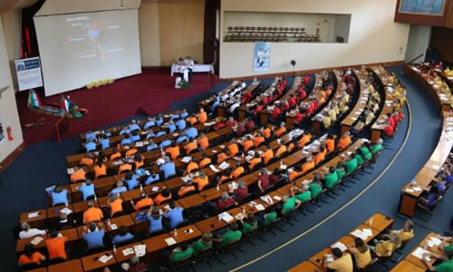 Sacerdotes e AEs em reunião plenária, ouvindo elogiadas palestras.