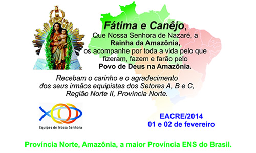 “A pedagogia das ENS é excelente. Se fizer tudo, é santo”, foi uma das frases mais marcantes do EACRE/2014 – Encontro Anual de Casais Responsáveis de Equipe dos Setores A, B e C (Belém), no final de semana 01 e 02 de fevereiro. Quem a disse foi a Terezinha, do Artêmio, no Testemunho de um Casal com longa caminhada no Movimento. Este casal é CRE da Equipe 01A, a mais antiga do Estado, e entrou nas ENS na primeira hora, completando este ano 39 anos como equipista! Testemunhou a caminhada na construção do Movimento em Belém e da sua Espiritualidade Conjugal.