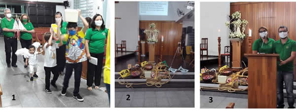(1) o Casal Responsável Regional, Bené e Nilson, conduz a imagem de N. S. de Nazaré, tendo a frente símbolos de romeiros pagadores de promessas e até um anjinho; (2) Os elementos usados na Procissão de Entrada/Círio depositados aos pés da imagem da Rainha da Amazônia. (3) O Casal Comentarista da Santa Missa, Vanessa e Che.